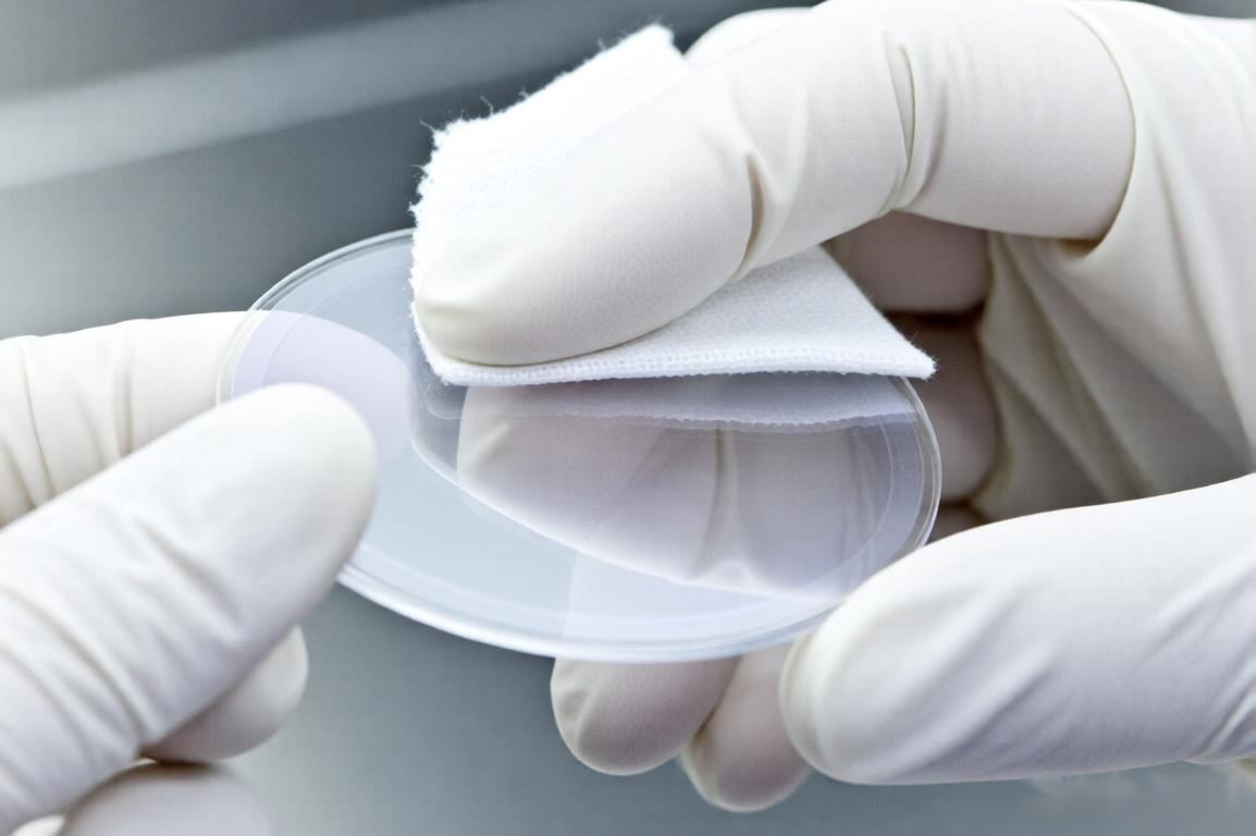 【“在半导体无尘室中,技术员小心地展开一张无尘纸,其多孔网状结构在显微镜下清晰可见,这些微小的孔隙能锁住尘埃却允许液体快速通过。”】